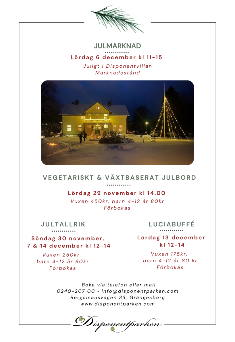 För bokade evenemang och avhämtning har vi öppet alla dagar. För att boka ring 0240-20700 eller maila info@disponentparken.com
